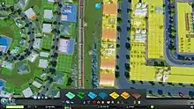 The game also features a robust transportation system based on Colossal Order's previous Cities in Motion, allowing the player to plan out effective public transportation for the city in order to reduce traffic congestion and generate transit revenue.[1] Roads can be built straight or free-form, and the grid used for zoning adapts to the shape of the adjacent roads; cities need not follow a square grid plan. Roads of varying widths (up to major freeways) accommodate different traffic volumes, and variant road types (for example, avenues lined with trees or highways with sound barriers) offer reduced noise pollution or increased property values in the surrounding area at an increased cost to the player.[5] The road system can be augmented with various forms of public transportation such as buses, taxis, trams, trains, ferries, and metro systems.