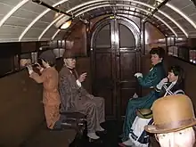 The original service was operated by trains composed of an engine and three carriages. Thirty-two passengers could be accommodated in each carriage,[16] which had longitudinal bench seating and sliding doors at the ends, leading onto a platform for boarding and alighting. It was reasoned that there was nothing to look at in the tunnels, so the only windows were in a narrow band high up in the carriage sides. Gate-men rode on the carriage platforms to operate the lattice gates and announce the station names to the passengers. Because of their claustrophobic interiors, the carriages soon became known as padded cells.[23] Unlike other railways, the C&SLR had no ticket classes or paper tickets; when the railway began operations, a flat fare of two pence, collected at a turnstile, was charged.[16] Despite the cramped carriages and competition from bus and tram services, the railway attracted 5.1 million passengers in 1891, its first year of operation.[24] To alleviate overcrowding, the fleet of rolling stock was enlarged.[25]