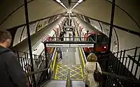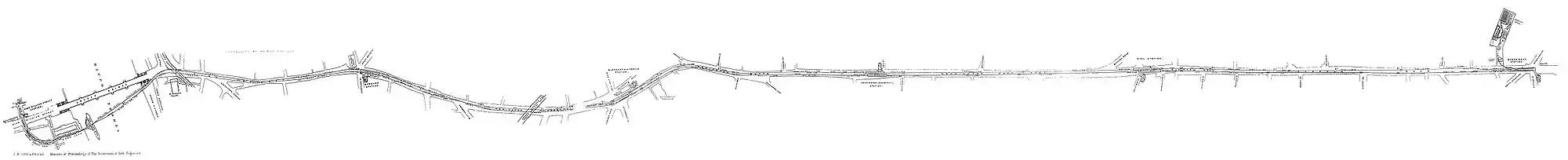 To avoid the need to purchase agreements for running under surface buildings, the tunnels were bored underneath public roads, where construction could be carried out without charge.[4] At the northern end of the railway, the need to pass deep beneath the bed of the River Thames and the medieval street pattern of the City of London constrained the arrangement of the tunnels on the approach to King William Street station. Because of the proximity of the station to the river, steeply inclined tunnels were built to the west of the station. Because of the narrow street under which they ran, they were bored one above the other rather than side by side as elsewhere.[4] The outbound tunnel was the lower and steeper of the two. The tunnels converged immediately before the station, which was in one large tunnel and comprised a single track with a platform on each side.[note 5] The other terminus at Stockwell was also constructed in a single tunnel but with tracks on each side of a central platform.[note 6]
