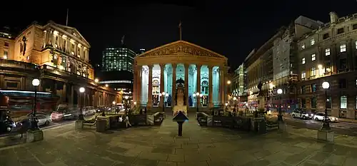 By the late 16th century, London increasingly became a major centre for banking, international trade and commerce. The Royal Exchange was founded in 1565 by Sir Thomas Gresham as a centre of commerce for London's merchants, and gained Royal patronage in 1571. Although no longer used for its original purpose, its location at the corner of Cornhill and Threadneedle Street continues to be the geographical centre of the city's core of banking and financial services, with the Bank of England moving to its present site in 1734, opposite the Royal Exchange. Immediately to the south of Cornhill, Lombard Street was the location from 1691 of Lloyd's Coffee House, which became the world-leading insurance market. London's insurance sector continues to be based in the area, particularly in Lime Street.