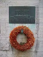 Stauffenberg was third in line to be executed, with Lieutenant von Haeften after. However, when it was Stauffenberg's turn, Lieutenant von Haeften placed himself between the firing squad and Stauffenberg, and received the bullets meant for Stauffenberg. When his turn came, Stauffenberg spoke his last words, "Es lebe das heilige Deutschland!" ("Long live our sacred Germany!"),[47][48] or, possibly, "Es lebe das geheime Deutschland!" ("Long live the secret Germany!"), in reference to Stefan George and the anti-Nazi circle.[48][49] Fromm ordered that the executed officers (his former co-conspirators) receive an immediate burial with military honours in the Alter St.-Matthäus-Kirchhof in Berlin's Schöneberg district. The next day, however, Stauffenberg's body was exhumed by the SS, stripped of his medals and insignia, and cremated.[50]