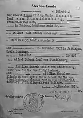 Stauffenberg married Nina Freiin von Lerchenfeld on 26 September 1933 in Bamberg.[62] They had five children: Berthold, Heimeran, Franz-Ludwig, Valerie, and Konstanze, who was born in Frankfurt on the Oder seven months after Stauffenberg's execution. Stauffenberg lived with his family in Berlin-Wannsee. Berthold, Heimeran, Franz-Ludwig, Valerie and Kostanze, who were not told of their father's deed,[63] were placed in a foster home for the remainder of the war and were forced to use new surnames, as Stauffenberg was considered taboo.[64]