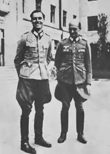 On 7 April 1943, Stauffenberg was involved in driving from one unit to another, directing their movement.[31] Near Mezzouna, his vehicle was part of a column strafed by P-40 Kittyhawk fighter bombers of the Desert Air Force – most likely from No. 3 Squadron RAAF[32] – and he received multiple severe wounds. Stauffenberg spent three months in a hospital in Munich, where he was treated by Ferdinand Sauerbruch. Stauffenberg lost his left eye, his right hand, and two fingers on his left hand.[33] He jokingly remarked to friends never to have really known what to do with so many fingers when he still had all of them. For his injuries, Stauffenberg was awarded the Wound Badge in Gold on 14 April and for his courage the German Cross in Gold on 8 May.[34]
