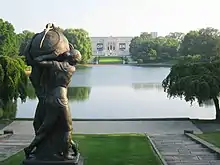 View of the museum from the steps of the Euclid Avenue entrance to Wade Park, overlooking the Lagoon. Seen in the foreground is Frank Jirouch's 1928 bronze sculpture, Night Passing the Earth to Day.