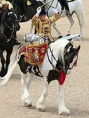 Some Clydesdales are used for riding and can be shown under saddle, as well as being driven. Due to their calm disposition, they have proven to be very easy to train and capable of making exceptional trail horses. Clydesdales and Shires are used by the British Household Cavalry as drum horses, leading parades on ceremonial and state occasions. The horses are eye-catching colours, including piebald, skewbald, and roan. To be used for this purpose, a horse must stand a minimum of 173 cm (17 h). They carry the Musical Ride Officer and two silver drums weighing 56 kilograms (123 lb) each.[29][30] The reins are controlled with the feet instead of the hands.[31][32]