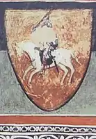 The coat of arms of Lithuania originate from rulers depictions on seals.[2][48] Originally the riding horseman symbolized the ruler of the Duchy of Lithuania (Duchy of Vilnius), which was the most important land of the state.[99] Algirdas was probably the first ruler to use a seal with a depiction of himself on horseback. The seal, which was attached to Polish-Lithuanian treaty of 1366, wasn't preserved,[48][65] and we know its appearance only thanks to historian Tadeusz Czacki who claimed to have seen the seal.[4][36] The oldest preserved such seal is Jogaila's seal that he was using in years 1377–1380, when he became Grand Duke of Lithuania.[100] Duke of Kernavė Vygantas' seal of 1388 is the oldest preserved seal with a riding knight depicted on the shield, giving it a status of a coat of arms.[101][48] Jogaila and other Algirdas sons: Skirgaila, Lengvenis, Kaributas, Vygantas, and Švitrigaila all were using seals with a horseman-type images.[8][48] The horseman was chosen due to at the time flourishing culture of knighthood in Europe.[65] At first, the charging knight was depicted riding to left or right, and holding a lance instead of the sword: two seals of Lengvenis of 1385 and of 1388 exhibit this change.[102] Initially Kęstutis and his son Vytautas were depicted on their seals as standing warriors. Only later Vytautas adopted, like other Lithuanian dukes, the image of a riding knight.[103]