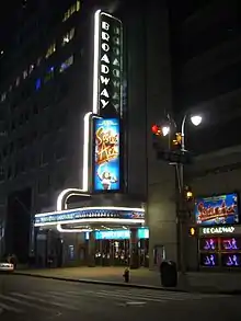The Shuberts renovated the Broadway's interior for $8 million prior to the April 1986 opening of the musical Big Deal,[21] which flopped after 70 performances.[242][243] Elvis Costello hosted a rock concert that October,[244][245] and the popular musical Les Misérables opened at the Broadway in March 1987.[246][247] While the LPC commenced a wide-ranging effort to grant landmark status to Broadway theaters in 1987,[248] the Broadway was among the few theaters for which the LPC denied either exterior or interior landmark status.[249][lower-alpha 2] It was also the Shuberts' only Broadway theater that was not designated as a landmark.[13] The theater's exterior was renovated with the construction of 1675 Broadway.[21] The musical Miss Saigon was booked for the theater in early 1990,[251] forcing the relocation of Les Misérables.[252] Miss Saigon opened in April 1991,[253][254] running at the Broadway for 4,095 performances through January 2001.[255] During the 1990s and 2000s, The Late Show With David Letterman (produced at the nearby Ed Sullivan Theater) often taped pranks in front of the Broadway's 53rd Street facade, which was soon filled with show posters.[253]