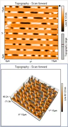 CD data is represented as tiny indentations known as pits, encoded in a spiral track molded into the top of the polycarbonate layer. The areas between pits are known as lands. Each pit is approximately 100 nm deep by 500 nm wide, and varies from 850 nm to 3.5 µm in length.[5] The distance between the tracks (the pitch) is 1.6 µm.[6][7][8]