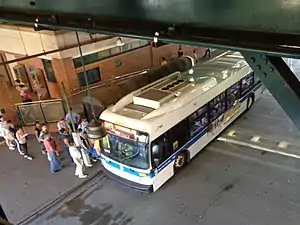 In 1956, residents of Coney Island protested against paying a transfer to the bus on Mermaid Avenue (now the B74 bus to Sea Gate), with some saying that the 15-cent fee for transferring should be abolished because the bus was essentially an adjunct to the station.[27] In 1979, the City Planning Commission proposed something similar, in that Coney Island residents would get a free transfer between the B36/B74 bus routes and the subway station.[28] It was noted that the station was the only one that did not get a free bus transfer after the corresponding subway transfer was discontinued (in sharp contrast to the BMT Culver Line, BMT Myrtle Avenue Line, and IRT Third Avenue Line, which were discontinued but replaced by bus transfers). The free transfers would allow a $200 million apartment complex nearby, funded by the government, to get more residents to move in, as well as diversify Mark Twain Junior High School and attract a stable middle class.[28] The experimental free transfer was instituted in November 1980, following three years of continuous advocacy by a Coney Island tenants' group. At the time, subway and bus fares were separate and cost a combined $1.20. The first phase of the program allowed riders to transfer for free, paying a 60-cent combined fare, while the second phase allowed for a half-price transfer, with the combined fare being 90 cents.[29] Schedules showing trains' departure times were installed at the Coney Island Terminal in 1965.[30]