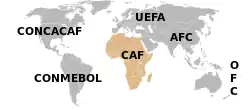 The Confederation of African Football (CAF)[lower-alpha 1] is the administrative and controlling body for association football, beach soccer, and futsal in Africa. It was established on 8 February 1957 at the Grand Hotel[1] in Khartoum, Sudan[2] by the national football associations of Egypt, Ethiopia, South Africa and Sudan,[3] following formal discussions between the aforementioned associations at the FIFA Congress held on 7 June 1956 at Avenida Hotel in Lisbon, Portugal.[4]