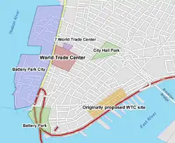 The new site constituted a mostly trapezoidal plot of land, with an extension on the north that resembled a "cork".[40] The bulk of the land was a twelve-block area bounded by Vesey, Church, Liberty, and West Streets on the north, east, south, and west, respectively.[40][41] All of these blocks would be combined to form the superblock upon which the World Trade Center was built.[41] The "cork" was a smaller trapezoid bounded clockwise from the north by Barclay Street, West Broadway, Vesey Street, and Washington Street. This would become the site of 7 World Trade Center, although that building was not added until much later. The two blocks to the west and east of the "cork" were occupied by the New York Telephone Company Building and the Federal Building, respectively.[40]