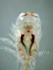 As with other crustaceans, copepods have a larval form. For copepods, the egg hatches into a nauplius form, with a head and a tail but no true thorax or abdomen. The larva molts several times until it resembles the adult and then, after more molts, achieves adult development. The nauplius form is so different from the adult form that it was once thought to be a separate species. The metamorphosis had, until 1832, led to copepods being misidentified as zoophytes or insects (albeit aquatic ones), or, for parasitic copepods, 'fish lice'.[1]
