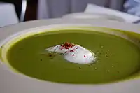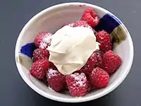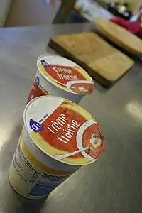 Crème fraîche (English pronunciation: /ˌkrɛmˈfrɛʃ/, French pronunciation: [kʁɛm fʁɛʃ] ⓘ, lit. "fresh cream") is a dairy product, a soured cream containing 10–45% butterfat, with a pH of approximately 4.5.[1] It is soured with a bacterial culture. European labeling regulations specify the two ingredients must be cream and bacterial culture. It is served over fruit and baked goods, as well as being added to soups and sauces. It is used in a variety of other recipes. Sour cream is a similar foodstuff, except that crème fraîche is less sour and has a higher fat content. Sour cream may contain thickening agents not permitted in crème fraîche in many jurisdictions .