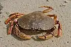 Cancer pagurus, the edible crab or brown crab, is a species found in the North Sea, North Atlantic and the Mediterranean Sea. It is a robust crab of a reddish-brown colour, having an oval carapace with a characteristic "pie crust" edge and black tips to the claws.[11] Mature adults may have a carapace width of up to about 25 cm and weigh up to 3 kg.