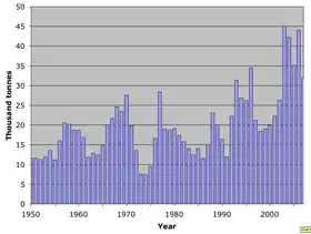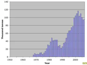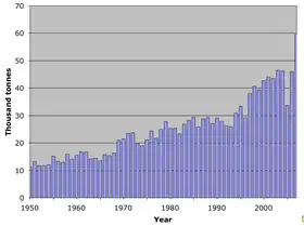 The following table summarises crab production from 2000 to 2008, both caught wild and from aquaculture, in tonnes.[1][4]