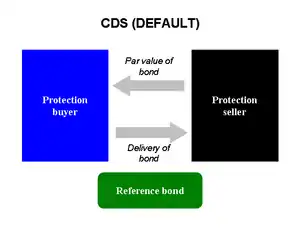 If the reference bond defaults, the protection seller pays par value of the bond to the buyer, and the buyer transfers ownership of the bond to the seller