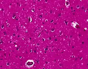 The classic histologic appearance is spongiform change in the gray matter: the presence of many round vacuoles from one to 50 micrometers in the neuropil, in all six cortical layers in the cerebral cortex or with diffuse involvement of the cerebellar molecular layer.[54] These vacuoles appear glassy or eosinophilic and may coalesce. Neuronal loss and gliosis are also seen.[55] Plaques of amyloid-like material can be seen in the neocortex in some cases of CJD.[56]