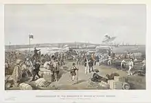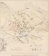 In June 1854, the Allied expeditionary force landed at Varna, a city on the Black Sea's western coast, but made little advance from its base there.[77] Karl Marx was noted to have quipped that "there they are, the French doing nothing and the British helping them as fast as possible".[78] In July 1854, the Ottomans, under Omar Pasha, crossed the Danube into Wallachia and on 7 July 1854 engaged the Russians in the city of Giurgiu and conquered it. The capture of Giurgiu by the Ottomans immediately threatened Bucharest in Wallachia with capture by the same Ottoman army. On 26 July 1854, Nicholas I, responding to an Austrian ultimatum, ordered the withdrawal of Russian troops from the principalities. Also, in late July 1854, following up on the Russian retreat, the French staged an expedition against the Russian forces still in Dobruja, but it was a failure.[79]