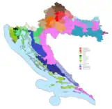 The oldest preserved record of the Croatian ethnonym's native variation *xъrvatъ is of the variable stem, attested in the Baška tablet in style zvъnъmirъ kralъ xrъvatъskъ ("Zvonimir, Croatian king"),[18] while the Latin variation Croatorum is archaeologically confirmed on a church inscription found in Bijaći near Trogir dated to the end of the 8th or early 9th century.[19] The presumably oldest stone inscription with fully preserved ethnonym is the 9th-century Branimir inscription found near Benkovac, where Duke Branimir is styled Dux Cruatorvm, likely dated between 879 and 892, during his rule.[20] The Latin term Chroatorum is attributed to a charter of Duke Trpimir I of Croatia, dated to 852 in a 1568 copy of a lost original, but it is not certain if the original was indeed older than the Branimir inscription.[21][22]