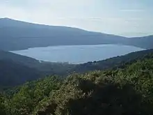 The availability of water varies significantly throughout the region. The area between Rijeka and Vinodol contains numerous freshwater springs that are largely tapped for water supply systems.[26] Water significantly contributed to the geomorphology of the area, especially in the Bay of Bakar, a ria located between Rijeka and Kraljevica.[27] At the seaward slopes of Velebit, in areas near Senj and Karlobag, surface watercourses are sparse. They form losing streams flowing to the sea, while springs of lower yield dry up during summer.[28] The most significant watercourse in the region is the 17.5-kilometre (10.9-mile) long Rječina River,[29] flowing into the Adriatic Sea in the city of Rijeka.[30] The islands of Cres, Krk, and Lošinj have significant surface water that is used as the primary water supply source on those islands. The most significant among them is Lake Vrana on the island of Cres, containing 220,000,000 cubic metres (7.8×109 cubic feet) of water.[29] The surface of the freshwater lake is at 16 metres (52 feet) above sea level, while its maximum depth is 74 metres (243 feet).[14] The Gulf of Kvarner is an especially significant area for the preservation of biodiversity.[31]