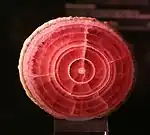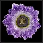 Circular ring aggregates around a center. This habit is found in cross-sections from reniform/mamillary habits, and also from elongated stalactites of amethyst (quartz), malachites, rhodocrosite, and others | agate, quartz, malachite, rhodocrosite | ||