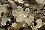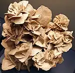 Platy, radiating rose-like aggregate (also lens shaped crystals) | gypsum, baryte, calcite | ||