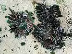 Star-like, radial fibers found inside spherical habits, such as mamillary or reniform. | hematite, pectolite, shattuckite, wavellite | ||