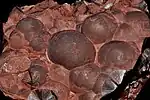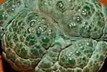 Breast-like: surface formed by intersecting partial spherical shapes, larger version of botryoidal and/or reniform, also concentric layered aggregates. | chalcedony, hematite, malachite | ||