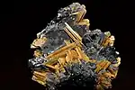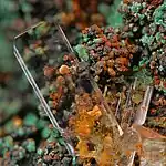 Crystals forming triangular net-like intergrowths. | cerussite, rutile | ||