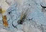 Crystal growth stops and continues at the top of the crystal, but not at the bottom. Exceptional aggregates of this habit (such as quartz) are often referred as "Elestial". | baryte, calcite, marcasite, quartz | ||