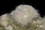 Needle-like, slender, and end-tapered prisms growing in a radial/globular fashion. | natrolite, scolecite, yuanfuliite | ||