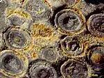 Small cirumferences or grains (commonly flattened) that resemble eggs | aragonite, calcite | ||