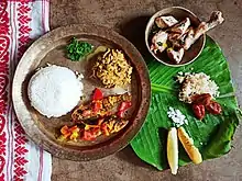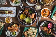 The cuisine of Andhra Pradesh and Telangana consists of the Telugu cuisine, of the Telugu people as well as Hyderabadi cuisine (also known as Nizami cuisine), of the Hyderabadi Muslim community.[104][105] Hyderabadi food is based heavily on non-vegetarian ingredients while, Telugu food is a mix of both vegetarian and non-vegetarian ingredients. Telugu food is rich in spices and chillies are abundantly used. The food also generally tends to be more on the tangy side with tamarind and lime juice both used liberally as souring agents. Rice is the staple food of Telugu people. Starch is consumed with a variety of curries and lentil soups or broths.[106][107] Vegetarian and non-vegetarian foods are both popular. Hyderabadi cuisine includes popular delicacies such as Biryani, Haleem, Baghara baingan and Kheema, while Hyderabadi day to day dishes see some commonalities with Telanganite Telugu food, with its use of tamarind, rice, and lentils, along with meat.[106] Yogurt is a common addition to meals, as a way of tempering spiciness.[108]