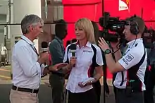 Hill has also regularly appeared in the British media. In June 1975 he appeared alongside his father on the popular television programme Jim'll Fix It.[92] He again appeared on the programme in January 1995, marking the twentieth anniversary of the show.[93] He has contributed many articles to F1 Racing magazine and has twice appeared in ITV F1's commentary box, covering for Martin Brundle at the 2007 and 2008 Hungarian Grands Prix.[94] British Sky Broadcasting signed Hill to join their F1 presentation team on Sky Sports F1 as a British driver's pundit starting from the 2012 Formula One World Championship.[95]
