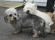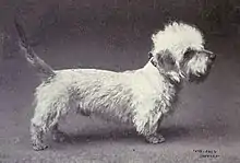 Some interbreeding with other breeds took place in the mid-1800s, which may have introduced Dachshund blood into the breed,[11][12] although certain breeders maintained pure-bred lines.[11] The Dachshund theory was first introduced by John Henry Walsh under the pseudonym of "Stonehenge" in the 1880s,[13] and was denied by many breeders of that era.[14] By the mid-1800s, the breed was known as the Dandie Dinmont Terrier, and became sought after for hunting after Scott's writings were published.[7] They remain the only dog breed to have been named after a fictional character.[15] Around this time the breed had some involvement in the development of the Bedlington Terrier.[16]