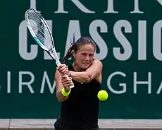Seeded fourth, Kasatkina reached the final at the Birmingham Classic. This was her eighth career final, first on grass and third of 2021.[101] Her run started with a comeback from 4–6, 0–3 against Polona Hercog in the first round,[102] before avenging her loss against Kostyuk,[103] ousting Tereza Martincová and CoCo Vandeweghe to reach the final.[104] However, she lost to Ons Jabeur in straight sets.[105] She lost in the quarterfinals of the Eastbourne International to Jeļena Ostapenko[106] after securing her first top ten win in two years over Iga Świątek, losing just one game after dropping the opening set.[107] Kasatkina's grass-court season ended with a second-round appearance at the Wimbledon Championships, losing to Ostapenko 6–8 in the final set.[108]