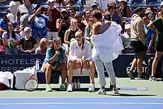 In the middle of the season, Kasatkina again reached the third round at two more Grand Slam events, the French Open and Wimbledon. At both tournaments, she lost tight matches that each ended 10–8 in the third set, the former against Kiki Bertens and the latter against No. 8, Venus Williams.[34][35] She had two chances to serve out the match against Bertens.[36] Kasatkina continued her success at big tournaments at the Premier 5 Canadian Open, where she reached the quarterfinals. She defeated world No. 8, Roberta Vinci, in the third round for her second career top ten victory.[37][38] Her next tournament was at the Rio Olympics. She qualified for the singles draw through her ranking, and also entered the doubles tournament with Svetlana Kuznetsova, after Margarita Gasparyan withdrew due to injury.[39] Kasatkina reached the quarterfinals at both events, falling just short of the medal rounds. She lost to American Madison Keys in singles and the Czech team of Andrea Hlaváčková and Lucie Hradecká in doubles.[40] At the US Open, her streak of four consecutive third-round appearances at majors was ended in the opening round by Wang Qiang.[41]