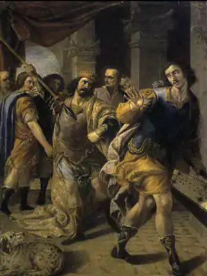 A similar passage occurs in 1 Samuel 26, when David is able to infiltrate Saul's camp on the hill of Hachilah and remove his spear and a jug of water from his side while he and his guards lie asleep. In this account, David is advised by Abishai that this is his opportunity to kill Saul, but David declines, saying he will not "stretch out [his] hand against the Lord's anointed".[45] In the morning, David once again demonstrates to Saul that, despite ample opportunity, he did not deign to harm him. Saul, despite having already reconciled with David, confesses that he has been wrong to pursue David, and blesses him.[46]