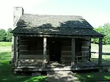 John married Rebecca Hawkins in 1780.[18] Their son David was born August 17, 1786,[19] and they named him after John's father.[lower-alpha 2] David was born in modern Greene County, Tennessee (then part of North Carolina), close to the Nolichucky River and near the community of Limestone.[lower-alpha 3] John continually struggled to make ends meet, and the Crocketts moved to a tract of land on Lick Creek in 1792.[25] John sold that tract of land in 1794 and moved the family to Cove Creek, where he built a gristmill with partner Thomas Galbraith.[26] A flood destroyed the gristmill and the Crockett homestead. The Crocketts then moved to Mossy Creek in Jefferson County, Tennessee, but John forfeited his property in bankruptcy in 1795.[27] The family next moved on to property owned by a Quaker named John Canady.[lower-alpha 4] At Morristown in the Southwest Territory, John built a tavern on a stage coach route.[lower-alpha 5]