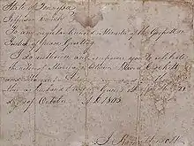He met Polly Finley and her mother Jean at a harvest festival.[44] Although friendly towards him in the beginning, Jean Finley eventually felt Crockett was not the man for her daughter.[45] Crockett declared his intentions to marry Polly, regardless of whether the ceremony was allowed to take place in her parents' home or had to be performed elsewhere. He arranged for a justice of the peace and took out a marriage license on August 12, 1806. On August 16, he rode to Polly's house with family and friends, determined to ride off with Polly to be married elsewhere. Polly's father pleaded with Crockett to have the wedding in the Finley home. Crockett agreed only after Jean apologized for her past treatment of him.[46]