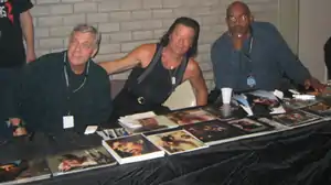 Tom Savini, who had been offered the chance to provide special effects and make-up for Romero's first zombie film, Night of the Living Dead, before being drafted into the Vietnam War, made his debut as an effects artist on Dawn of the Dead.[22] Savini had been known for his make-up in horror for some time, prior to Dawn of the Dead, and in his book explaining special effects techniques, Bizarro, explains how his time in Vietnam influenced his craft.[23] He had a crew of eight to assist in applying gray makeup to two to three hundred extras each weekend during the shoot. One of his assistants during production was Joseph Pilato, who played a police captain in the film and would go on to play the lead villain in the film's sequel, Day of the Dead, Captain Henry Rhodes.[24]