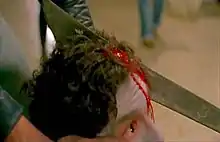 A cast of Ross' head that was to be used in the original ending of the film (involving a suicide rather than the escape scene finally used) ended up as an exploding head during the tenement building scene. The head, filled with food scraps, was shot with an actual shotgun to get the head to explode.[22] One of the unintentional standout effects was the bright, fluorescent color of the fake blood that was used in the film. Savini was an early opponent of the blood, produced by 3M, but Romero thought it added to the film, claiming it emphasised the comic book feel of the movie.[27]
