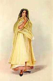 The women wear a two-piece dress called rida, distinct from hijab, purdah, and chador. Its distinguishing features are bright colors, decorative patterns and lace, and the fact that it does not cover a woman's face.[67] The rida is of any colour except black. A flap called pardi is folded to one side to allow a woman's face to be visible, but it can be worn over the face when desired.[68]