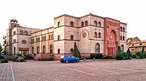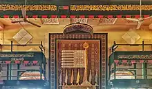 While a Dawoodi Bohra mosque is primarily a place of worship and congregation, it forms an important socio-cultural hub for the community. Besides sermons and discourses, the mosques are also a center for education and special religious lessons, in line with Fatimid traditions. A mosque complex usually houses several administrative offices along with ceremonial halls.[90] The mosques are built in a distinct Neo-Fatimid style,[90][91][92][93] with the names of Allah and verses from the Quran engraved on its walls.[90][94] The mosques are multi-storied structures; the main prayer hall in the ground floor, a voluminous space, is used by men while women congregate in the upper floors. The centre of the prayer hall is left as a void, making it possible for the women to hear and follow religious liturgy and sermons from the floors above.[27][28][95]