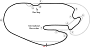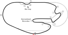 In 1984[20] and 1985,[21] the layout was modified, re-profiling road course turns 1 and 2, and moving what is now turn 3 (nicknamed the "International Horseshoe") closer to its preceding turns. Also, the chicane on the backstretch was modified. A new entry leg was constructed approximately 400 ft (120 m) earlier, resulting in a longer, three-legged, "bus stop" shape. Cars would now enter in the first leg, bypass the second leg, and exit out of the existing third leg. Passing would now be possible inside the longer chicane. The construction resulted in a final length of 3.560 mi (5.729 km) for the complete road course.