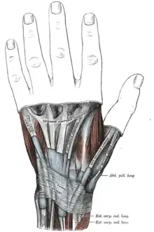 De Quervain syndrome occurs when two tendons that control movement of the thumb become constricted by their tendon sheath in the wrist.[3][5][6] This results in pain and tenderness on the thumb side of the wrist.[3] Radial abduction of the thumb is painful.[6] On occasion, there is uneven movement or triggering the thumb with radial abduction.[4] Symptoms can come on gradually or be noted suddenly.[4]