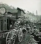 The gold rush attracted Chinese immigrants to the area; their population peaked at 250.[13] A few engaged in mining; most worked in service enterprises. A Chinese quarter arose on Main Street, as there were no restrictions on foreign property ownership in Dakota Territory, and a relatively high level of tolerance of different peoples existed in the frontier town. Wong Fee Lee arrived in Deadwood in 1876 and became a leading merchant. He was a community leader among the Chinese Americans until his death in 1921.[14]