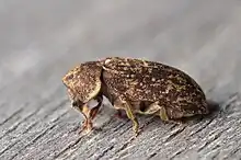 The deathwatch beetle (Xestobium rufovillosum) is a species of woodboring beetle that sometimes infests the structural timbers of old buildings. The adult beetle is brown and measures on average 7 mm (0.3 in) long. Eggs are laid in dark crevices in old wood inside buildings, trees, and inside tunnels left behind by previous larvae.[1] The larvae bore into the timber, feeding for up to ten years before pupating, and later emerging from the wood as adult beetles. Timber that has been damp and is affected by fungal decay is soft enough for the larvae to chew through. They obtain nourishment by using enzymes present in their gut to digest the cellulose and hemicellulose in the wood.