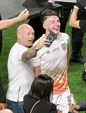 On 16 October 2022, Rice opened his goalscoring account for the season, scoring a curling effort from 22 yards (20 m) to secure West Ham a point in a 1–1 draw against Southampton.[35] On 20 April 2023, Rice scored West Ham's third in a 4–1 win in the UEFA Europa Conference League against Belgian side Gent, carrying the ball for more than 50 metres (55 yd) before finishing past Gent goalkeeper Davy Roef, resulting in a goal labelled "perhaps the standout strike of Rice's career" by The Daily Telegraph.[36] In May 2023, he was again named Hammer of the Year, for the 2022–23 season.[37] On 8 June 2023, Rice was named as the Europa Conference League's player of the season by UEFA as Rice captained West Ham to their first major European trophy since 1965 after a 2–1 win against Fiorentina in the final a day prior.[38] During the 2022–23 season, Rice won possession more than any other Premier League player. He also made the most interceptions of all Premier League players.[39]