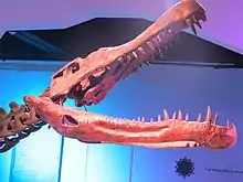 The American Museum of Natural History incorporated the skull and jaw fragments into a plaster restoration, modeled after the present-day Cuban crocodile. Colbert and Bird stated this was a "conservative" reconstruction, since an even greater length could have been obtained if a long-skulled modern species, such as the saltwater crocodile had been used as the template.[10] Because it was not then known that Deinosuchus had a broad snout, Colbert and Bird miscalculated the proportions of the skull, and the reconstruction greatly exaggerated its overall width and length. Despite its inaccuracies, the reconstructed skull became the best-known specimen of Deinosuchus, and brought public attention to this giant crocodilian for the first time.[14]